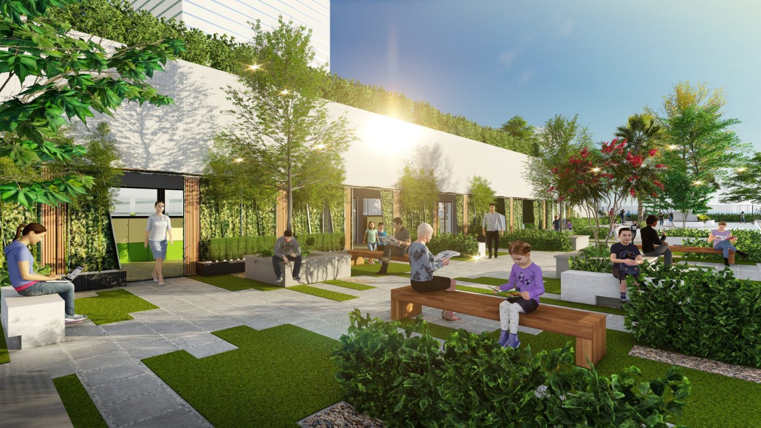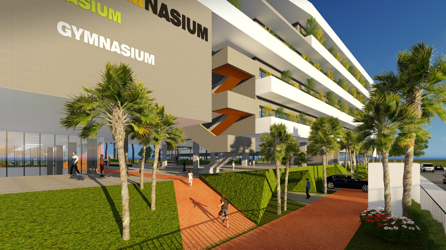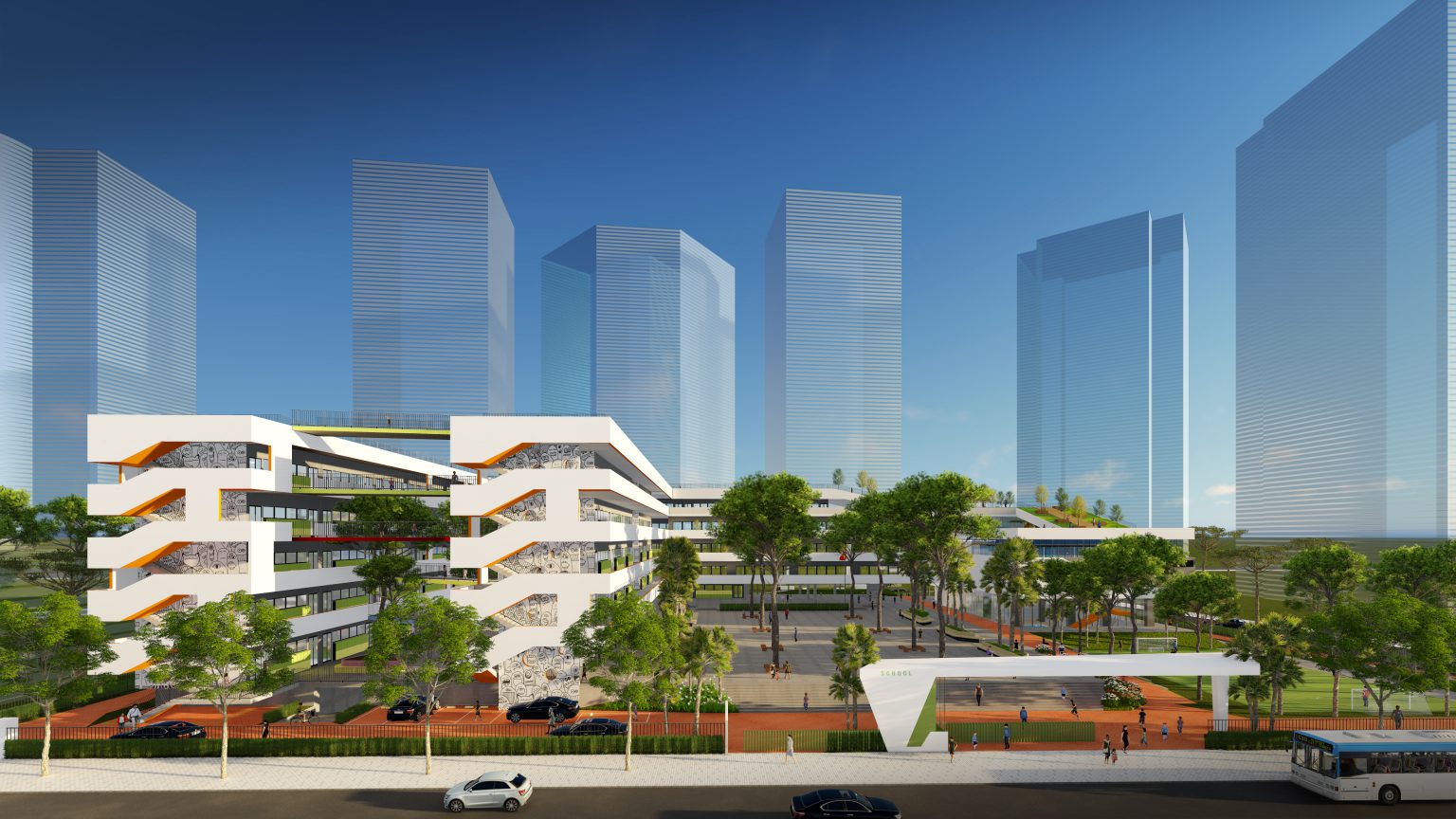 Với tiêu chí lấy học sinh làm trung tâm, các khối lớp học và thực hành của học sinh được ưu tiên bố trí tại các khu vực thuận lợi nhất (ưu tiên chiếu sáng tự nhiên theo hướng Bắc – Nam, đón hướng gió Đông Nam vào mùa hè và chắn hướng gió Đông Bắc vào mùa đông). Mặt tiền khối công trình dù sử dụng kính cách nhiệt hiện đại, thông qua giải pháp tổ chức các lớp học được kết nối với nhau và bao bọc bởi 600m hành lang không cột, có khẩu độ hợp lý, có hướng nhìn rất rộng ra các khu sân chơi và cây xanh, giúp hạn chế ánh nắng trực tiếp, cũng như cho phép ánh sáng tán xạ phục vụ mọi hoạt động của học sinh trong các phòng học.