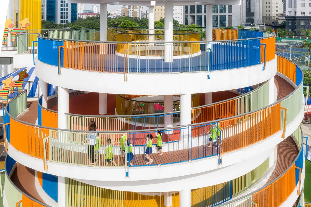 Trước yêu cầu đặt ra về gia tăng và tổ chức đồng bộ không gian hoạt động vui chơi và giáo dục thể chất cho học sinh, ý tưởng kiến trúc thiết đã tổ chức cấu trúc “Tháp vận động” có cấu trúc xoắn ốc, thu hẹp dần ở phía trên với mái che trên cùng, được kết nối hành lang cầu liên thông với khối lớp học. Một mặt, về thẩm mỹ kiến trúc, khối công trình tròn xoắn ốc giúp tổng thể kiến trúc toàn trường có tính động và hấp dẫn. Giải pháp thiết kế trên giúp làm tăng xấp xỉ 3 lần diện tích không gian hoạt động thể chất có mái che cho trường, mà còn tạo nên một không gian giao lưu – hoạt động tương tác thể chất rất hấp dẫn bởi tính liên hoàn và biến đổi không gian liên tục theo chiều đứng đầy ngẫu hứng và thú vị.