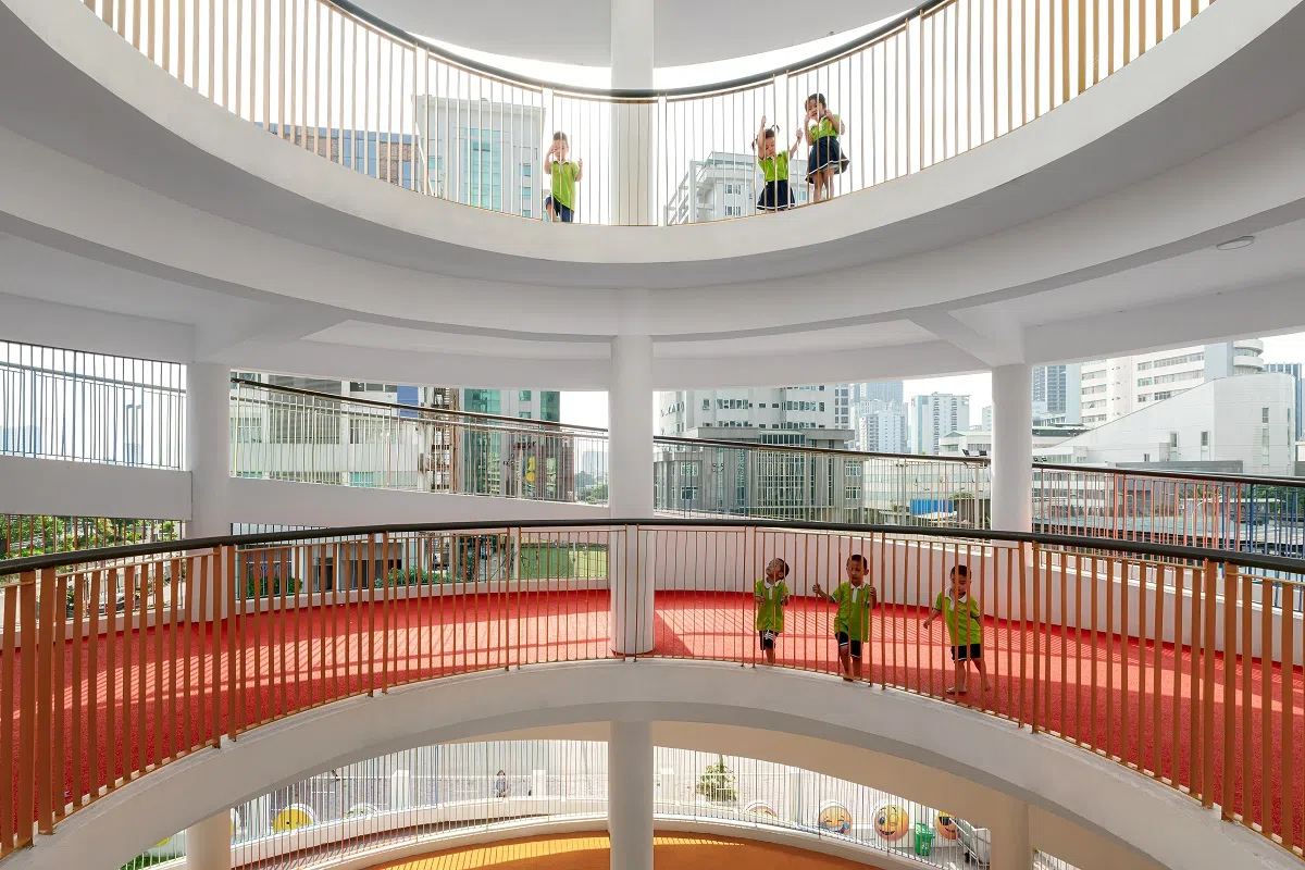Dù được xây dựng trên địa thế đất méo – hình thang, diện tích rất nhỏ hẹp với 3 mặt bị che chắn bởi các tòa nhà cao tầng, nhưng thiết kế công trình vẫn đảm bảo đủ các yêu cầu diện tích cho không gian học và vui chơi của học sinh, đảm bảo các tiêu chuẩn về ánh sáng, tổ chức vi khí hậu, cũng như an toàn.