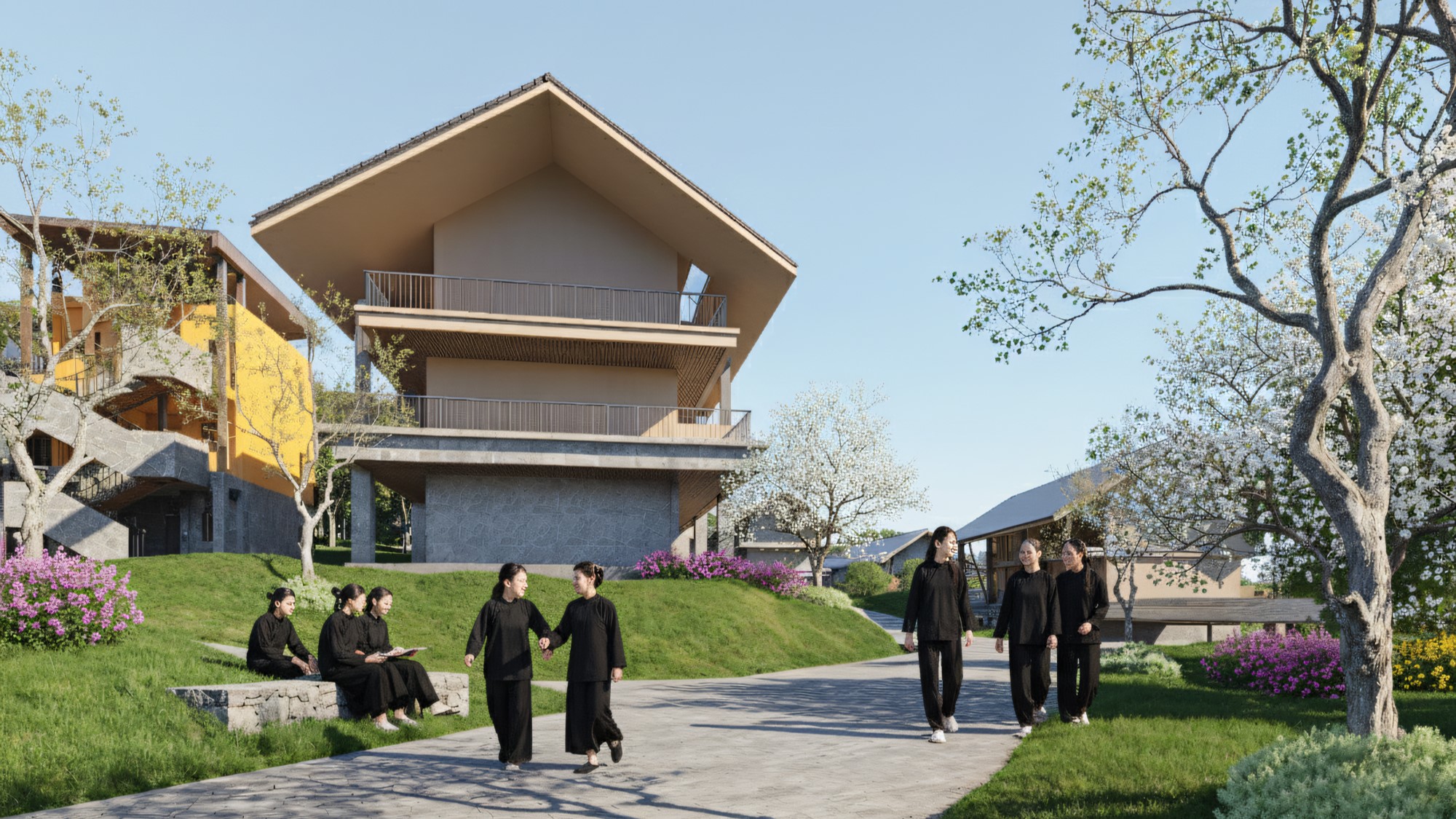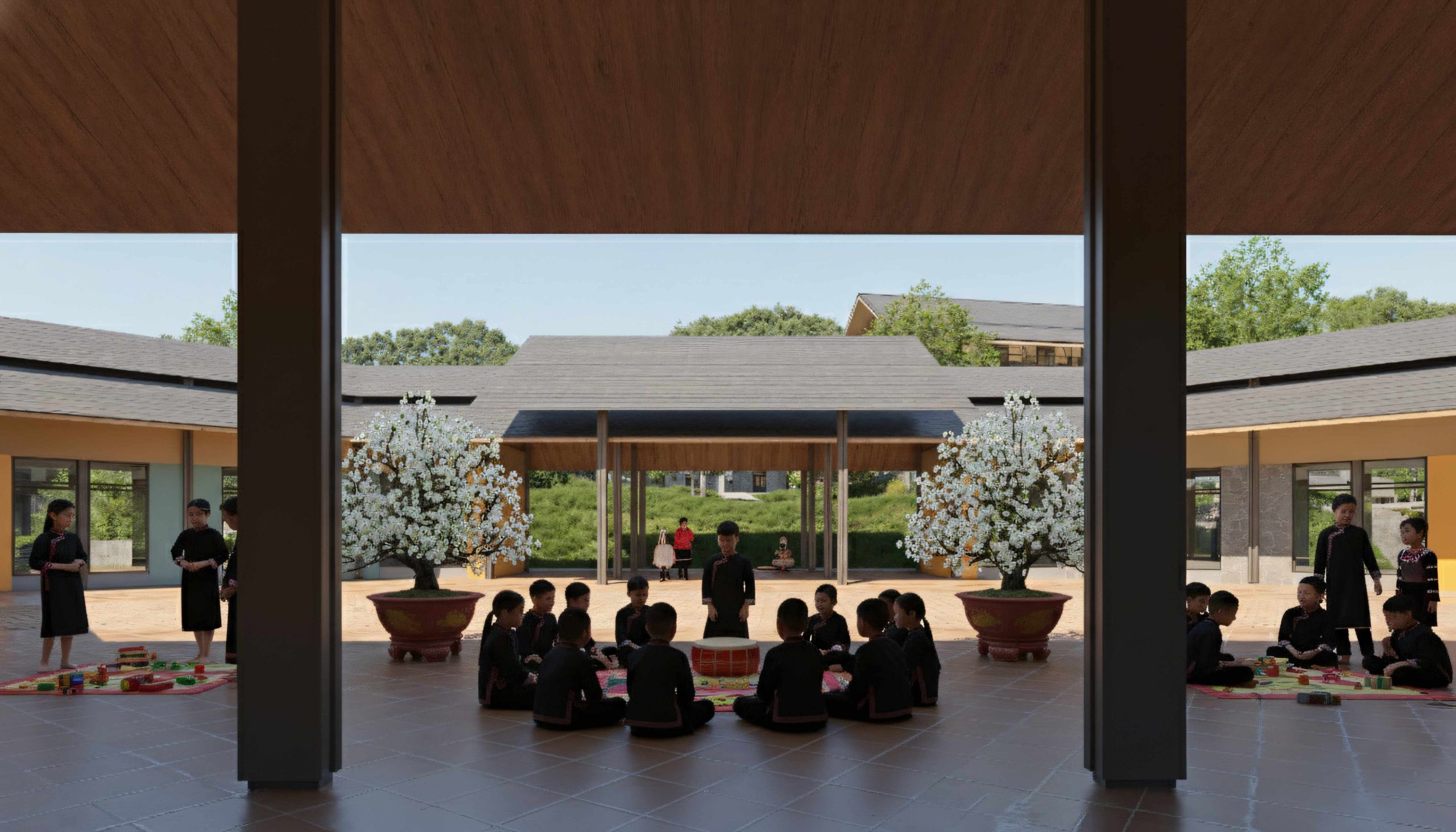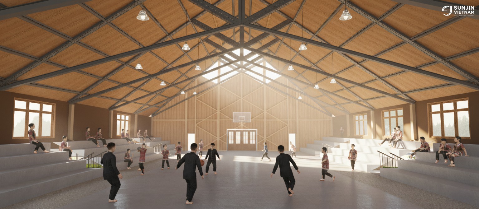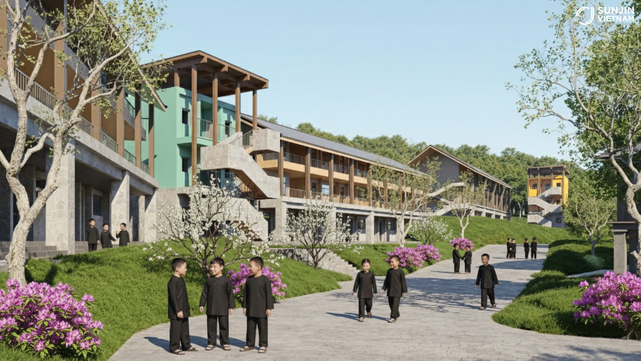 Giữ gìn bản sắc và kết nối cộng đồng. Trong thiết kế trường liên cấp nội trú, các kiến trúc sư Sunjin Vietnam hướng đến một không gian học tập mang đậm tinh thần dân tộc, nơi giá trị bản địa được chuyển hóa tinh tế qua ngôn ngữ kiến trúc hiện đại.