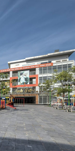 32 lớp học. 6 tầng. Diện tích khu đất : 6,797.30 m2 – Diện tích xây dựng : 2,551.00 m2 – Diện tích sàn : 13.072.00 m2