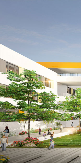 Quy mô: 32 lớp học. 6 tầng. Diện tích khu đất : 6,797.30 m2 – Diện tích xây dựng : 2,551.00 m2 – Diện tích sàn : 13.072.00 m2