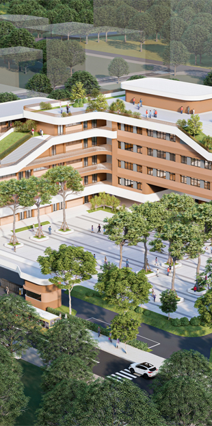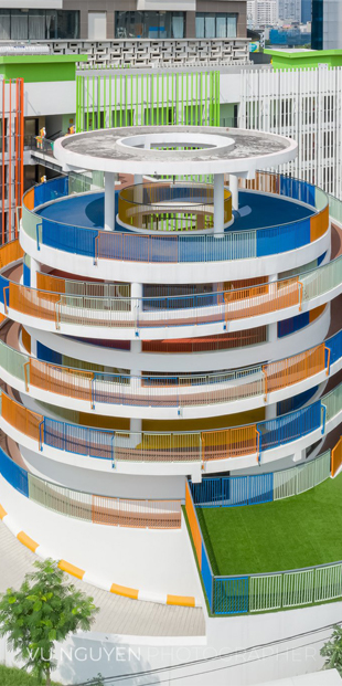 05 tầng. Gồm 48 lớp học. Diện tích đất: 11326 m2. Diện tích xây dựng: 3855 m2. Tổng diện tích sàn xây dựng: 8642 m2